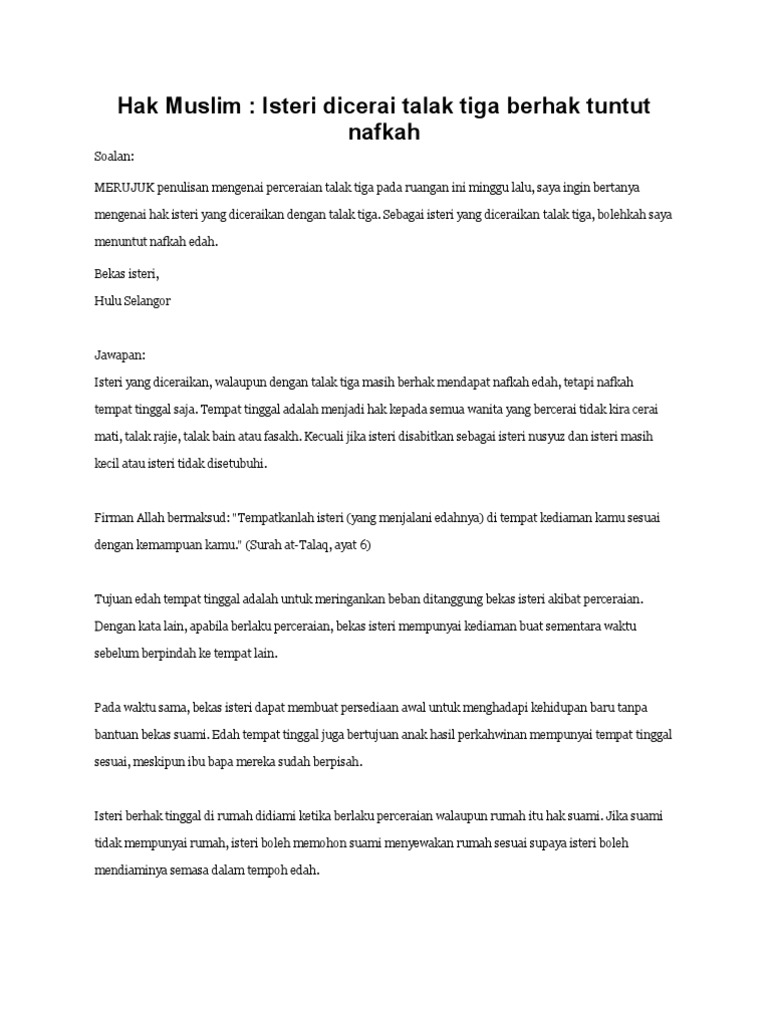 Hak Muslim Isteri Diceraikan Talaq Berhak Tuntut Nafkah Pdf