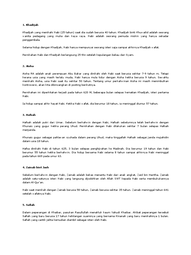Di samping itu kesemua anak baginda kecuali Ibrahim anak dari Mariah al-Qibtiyyah adalah kandungannya. Nabi Muhammad menghabiskan masa mudanya bersama Khadijah. A Halimatus Saadiah b Aminah c Khadijah d Zainab 3 Berapa lamakah Aminah menyusukan Nabi Muhammad SAW.